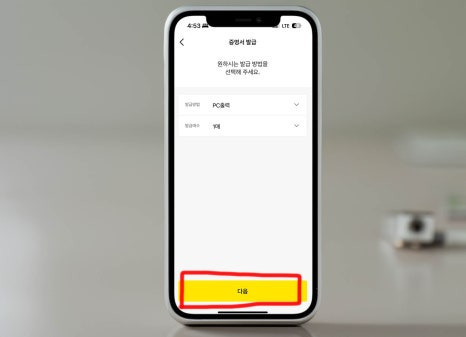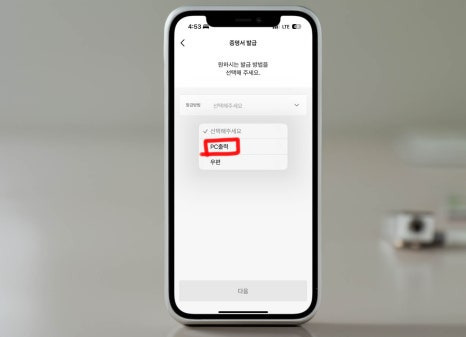 증명서 발급 방법을 선택해야 한다.