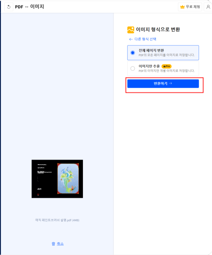 이후 화면 상단의 "변환하기" 버튼을 누르면 자동으로 변환이 시작됩니다.