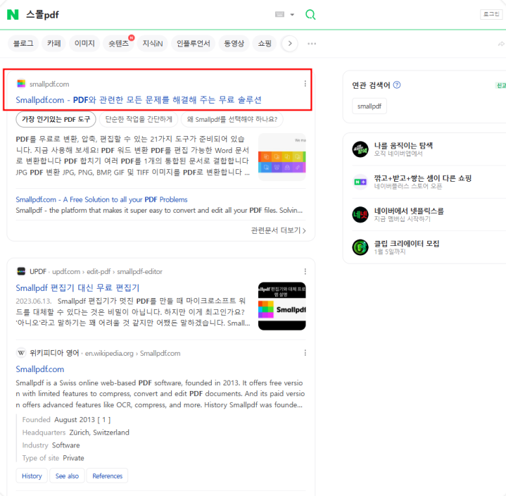 PDF파일 변환 사이트에 접속하려면 네이버 검색창에 "스몰PDF"를 검색을 합니다