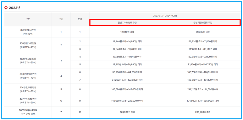2023년도 기준으로 월별 지역보험료 구간 및 직장보험료 구간을 확인해보시면 알 수 있습니다.