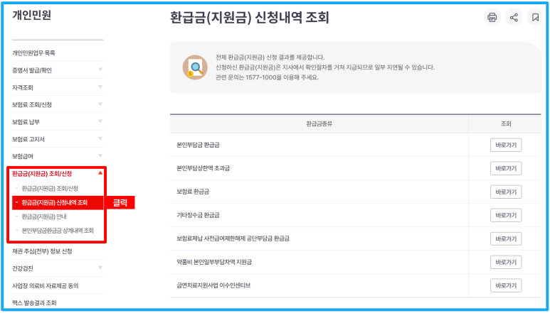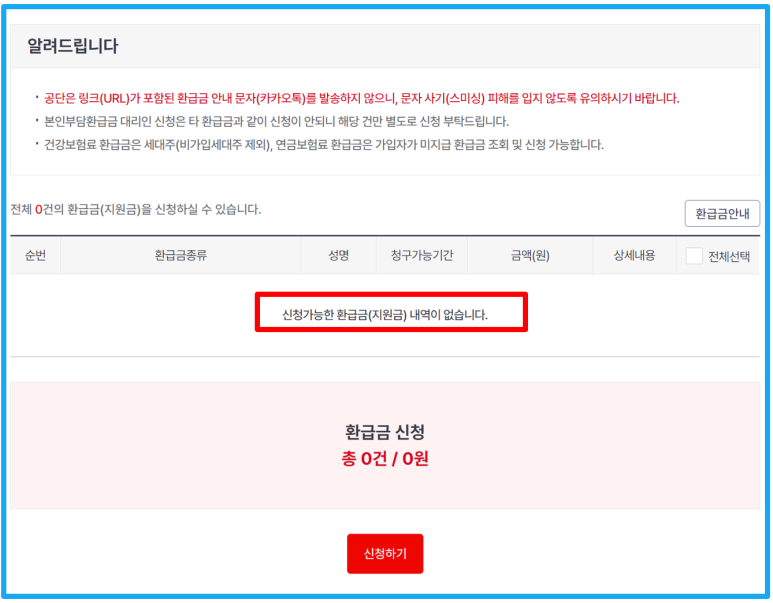 신청하신 후, '환급금 신청내역 조회'를 클릭하시면 신청한 내역을 환금금 종류별로 조회해보실 수 있습니다.
