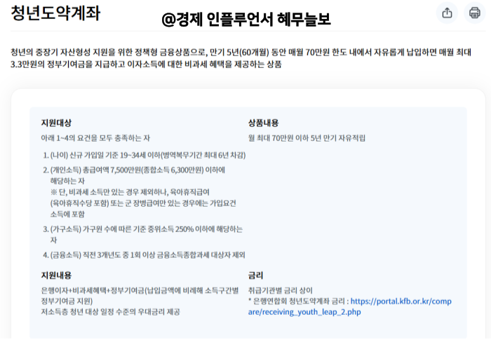 정부가 기여금을 얹어주고, 이자 소득에 세금도 면제해 주고, 금리까지 높은 복합형 금융상품이라고 볼 수 있다.