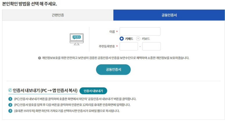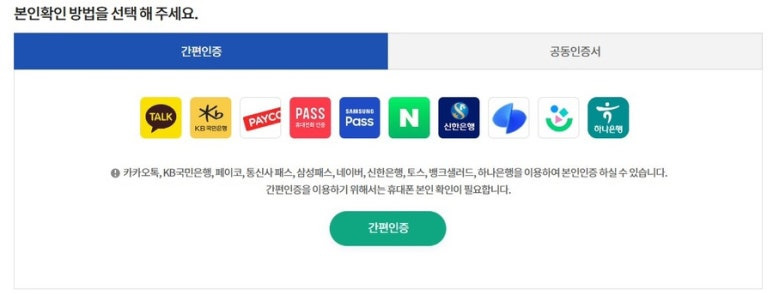 간편인증과 공동인증서 인증 중 선택.