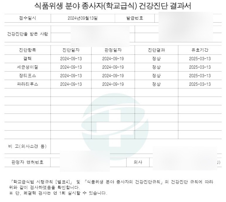음식업소, 급식소, 유흥업소 등 요식업 및 식품분야 종사자나 관련 공무원이 작업을 통해 타인에게 옮길 수 있는 심각한 전염병을 앓고있지 않다는 증명서이다.