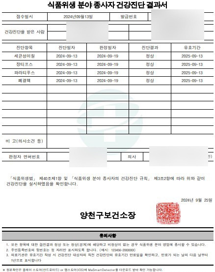 일반 병원에서도 가능하지만 보건소 이용을 강추드린다. 주변 분들 보니 일반 병원 검사비용이 더 비싸기도 하고, 무엇보다 보건소에 신청 시 발급된 보건증을 받으러 재방문할 필요 없이 집에서 인터넷 발급 출력이 가능하기 때문.