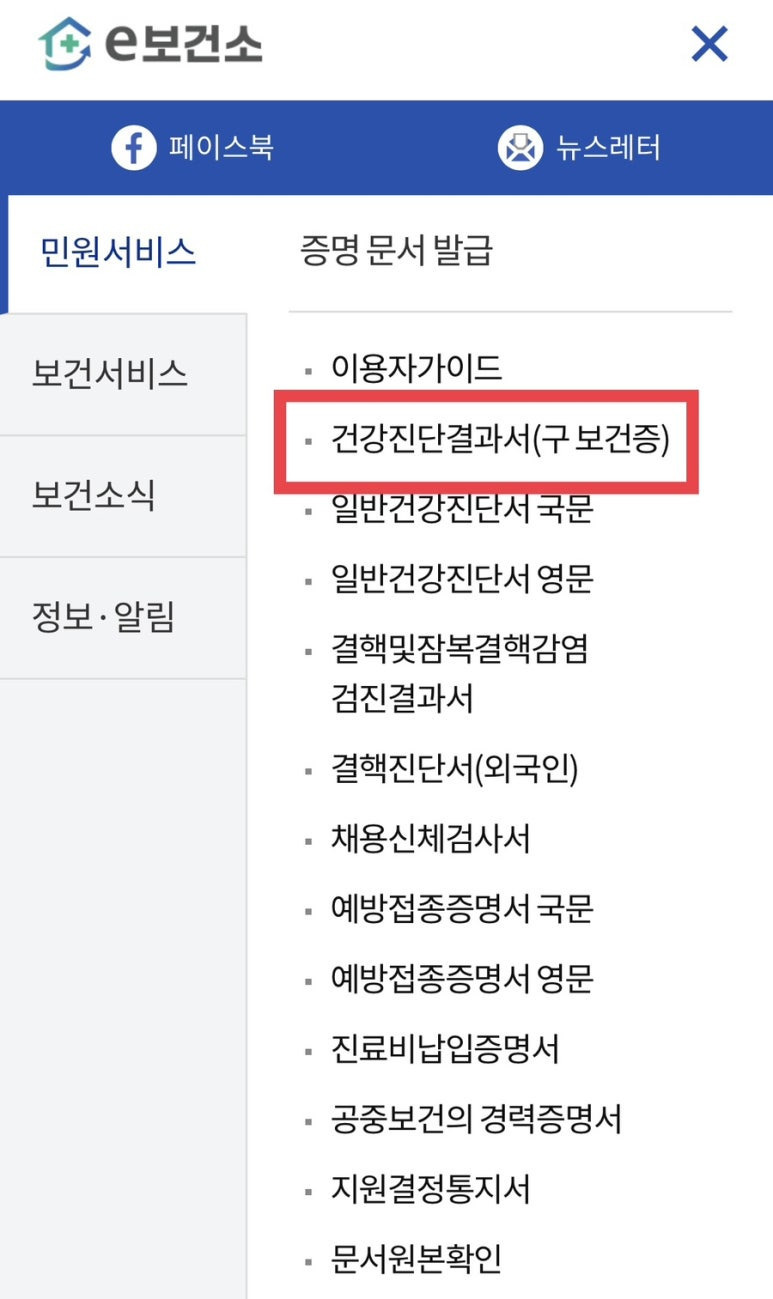 민원서비스 > 증명문서발급 > 건강진단결과서(구 보건증) 을 클릭하여 들어간다.